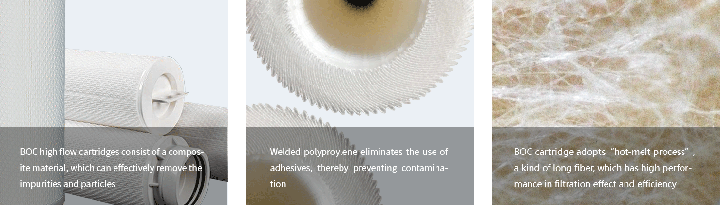 BOC high flow cartridges consist of a composite material, which can effectively remove the impurities and particles.The unique pleat-shaped design has a greater filtration surface ensuring stability of the flow-path. A plastic mesh is used in the supporting layer, which greatly reduces flow resistance, strengthens the filter material, increases cartridge filtering effect and service life. The cartridge is made of hot-melt welding polyproylene, a stable material used in a variety of critical applications.